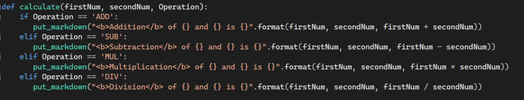 Let’s create a new function named calculate that will accept three parameters i.e., first number, second number and the operation.