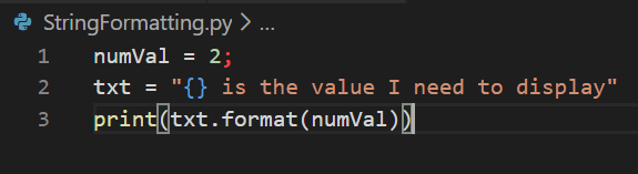 In the third line, using format method we will pass the value that has to be displayed in the string.