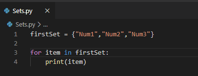 The above example shows that the set named “firstSet” is created and looped through the items inside the firstSet set so that it is printing the items from the set.