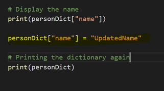 The highlighted statement personDict[“name”] = “UpdatedName” changes the value of name key from “Hepsi” to “UpdatedName”.