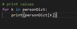 In the above code, k contains all the keys and we are accessing the values using the keys in the print statement.