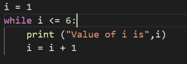 In the above code, we have a variable, assigned with a value 1. There is a condition in while loop i.e., i <= 6, which means it is checking if the value of i variable is less than or equal to 6.